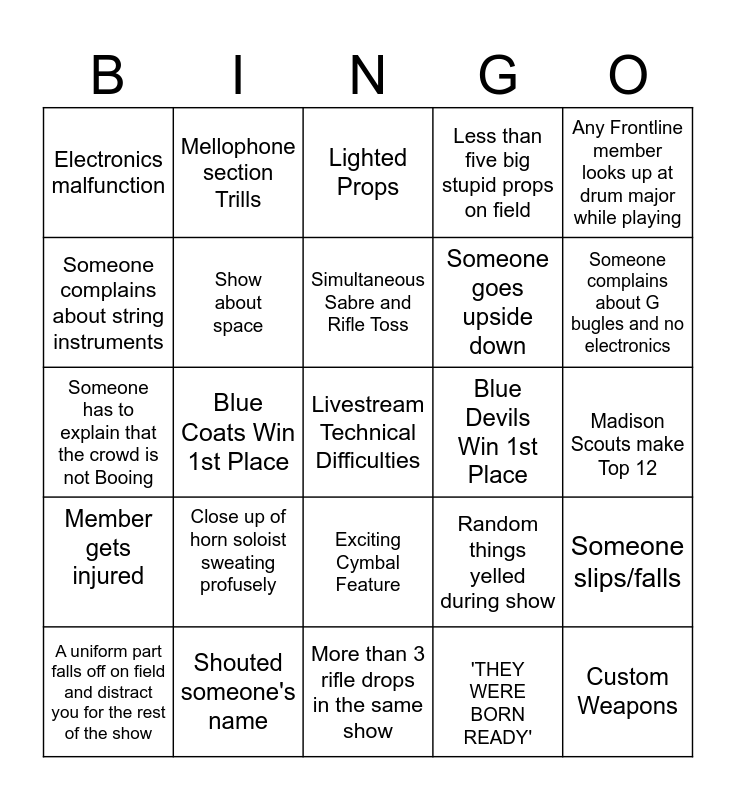 This bingo card has 35 words: You can hear battery Dutting on the field, Someone complains about Bb instruments, Close up shot of guard drop, Show about space, Exciting Cymbal Feature, Less than five big stupid props on field, Someone complains about string instruments, Horn line drill outside 5 yard line, Simultaneous Sabre and Rifle Toss, Inappropriate Guard Uniforms, Someone has to explain that the crowd is not Booing, Any Frontline member looks up at drum major while playing, Trumpet screamer misses high note, Marching member hit by flag, Electronics malfunction, Blue Devils Win 1st Place, 'THEY WERE BORN READY', Blue Coats Win 1st Place, Member gets injured, Livestream Technical Difficulties, Random things yelled during show, A uniform part falls off on field and distract you for the rest of the show, Someone slips/falls, Shouted someone's name, Lighted Props, Someone complains about G bugles and no electronics, Custom Weapons, A prop breaks in any way, Someone goes upside down, Madison Scouts make Top 12, Corps does NOT have a trombone feature, More than 3 rifle drops in the same show, Close up of horn soloist sweating profusely, Mellophone section Trills and Niagara Falls Drill Work.