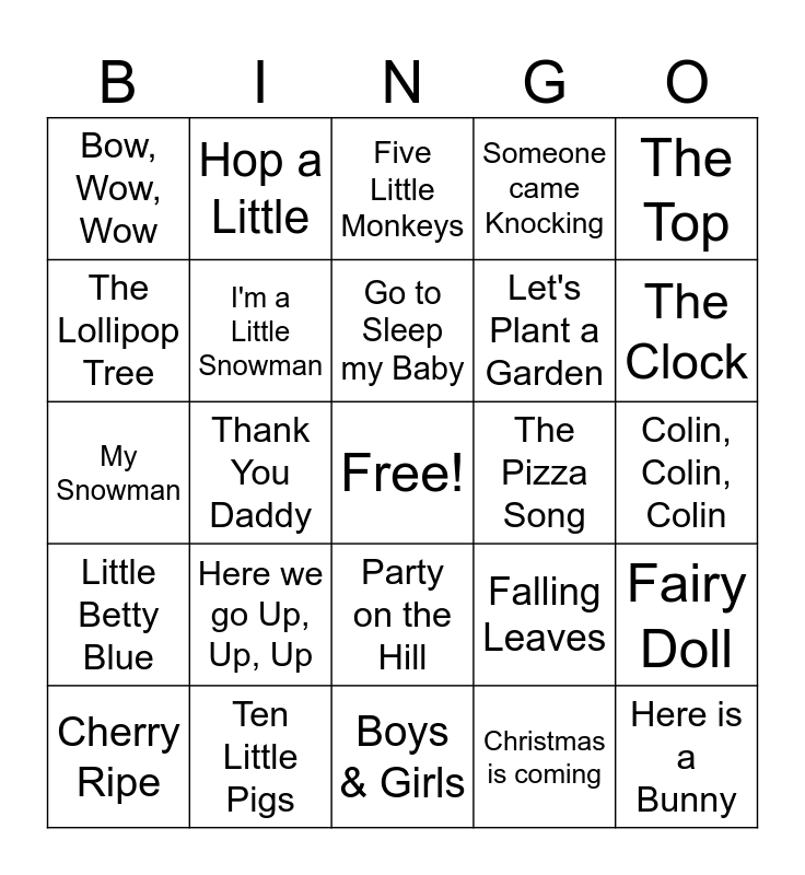 This bingo card has a free space and 30 words: Ten Little Pigs, An Apple a Day, Thank You Daddy, As I Was Going to St. Ives, Bow, Wow, Wow, Five Little Monkeys, I'm a Little Snowman, Party on the Hill, The Pizza Song, Boys & Girls, Colin, Colin, Colin, Here is a Bunny, Christmas is coming, Little Robin Redbreast on a Rail, The Clock, Five Little Birds, Falling Leaves, Little Betty Blue, Here we go Up, Up, Up, The Top, My Snowman, Look Outside, Hop a Little, Let's Plant a Garden, The Lollipop Tree, Someone came Knocking, Fairy Doll, Cherry Ripe, Go to Sleep my Baby and I do not like thee, Doctor Fell.