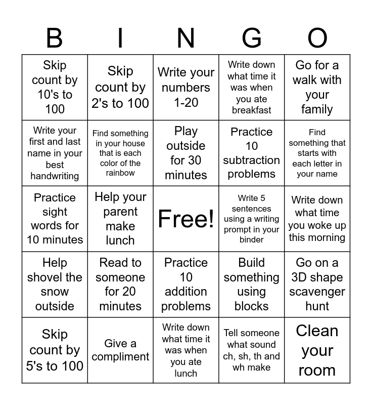 This bingo card has a free space and 24 words: Read to someone for 20 minutes, Give a compliment, Play outside for 30 minutes, Skip count by 5's to 100, Go for a walk with your family, Skip count by 10's to 100, Write your first and last name in your best handwriting, Skip count by 2's to 100, Write 5 sentences using a writing prompt in your binder, Practice 10 addition problems, Practice 10 subtraction problems, Practice sight words for 10 minutes, Build something using blocks, Go on a 3D shape scavenger hunt, Find something in your house that is each color of the rainbow, Tell someone what sound ch, sh, th and wh make, Write down what time you woke up this morning, Write your numbers 1-20, Find something that starts with each letter in your name, Help your parent make lunch, Clean your room, Help shovel the snow outside, Write down what time it was when you ate breakfast and Write down what time it was when you ate lunch.