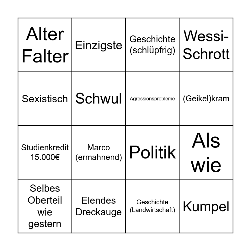 This bingo card has 16 words: Elendes Dreckauge, Als wie, Geschichte (schlüpfrig), Alter Falter, Studienkredit 15.000€, Einzigste, Politik, Geschichte (Landwirtschaft), Sexistisch, Schwul, Selbes Oberteil wie gestern, Wessi-Schrott, Marco (ermahnend), (Geikel)kram, Agressionsprobleme and Kumpel.