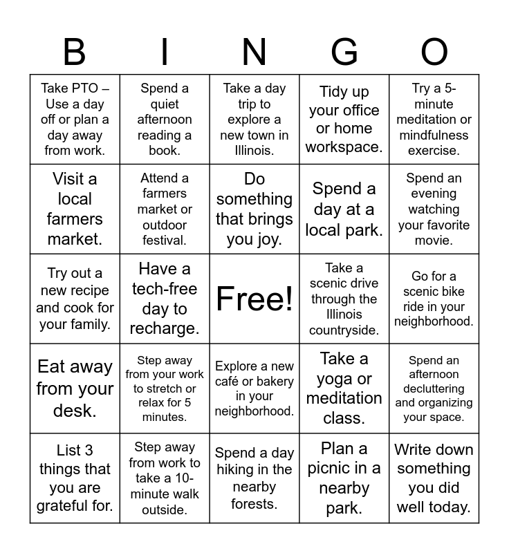 This bingo card has a free space and 24 words: Step away from your work to stretch or relax for 5 minutes., Step away from work to take a 10-minute walk outside., Do something that brings you joy., List 3 things that you are grateful for., Try a 5-minute meditation or mindfulness exercise., Take PTO – Use a day off or plan a day away from work., Visit a local farmers market., Spend a quiet afternoon reading a book., Take a scenic drive through the Illinois countryside., Explore a new café or bakery in your neighborhood., Spend a day at a local park., Try out a new recipe and cook for your family., Take a yoga or meditation class., Spend an afternoon decluttering and organizing your space., Attend a farmers market or outdoor festival., Plan a picnic in a nearby park., Go for a scenic bike ride in your neighborhood., Take a day trip to explore a new town in Illinois., Spend an evening watching your favorite movie., Have a tech-free day to recharge., Write down something you did well today., Eat away from your desk., Tidy up your office or home workspace. and Spend a day hiking in the nearby forests..
