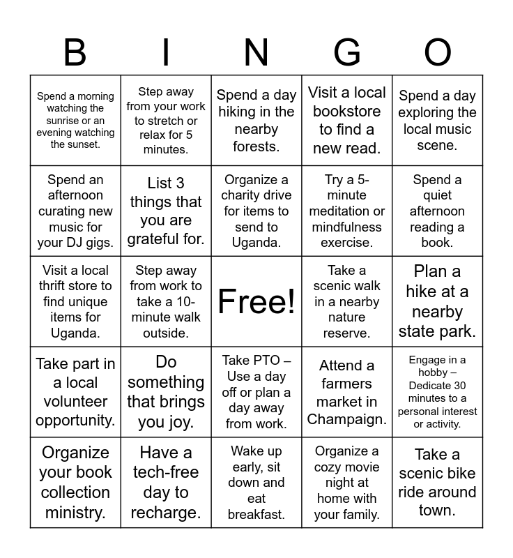 This bingo card has a free space and 24 words: Do something that brings you joy., Have a tech-free day to recharge., Organize a charity drive for items to send to Uganda., Organize your book collection ministry., Spend a day exploring the local music scene., Spend a morning watching the sunrise or an evening watching the sunset., Spend an afternoon curating new music for your DJ gigs., Step away from your work to stretch or relax for 5 minutes., Take a scenic walk in a nearby nature reserve., Take PTO – Use a day off or plan a day away from work., Try a 5-minute meditation or mindfulness exercise., Visit a local thrift store to find unique items for Uganda., Attend a farmers market in Champaign., Engage in a hobby – Dedicate 30 minutes to a personal interest or activity., List 3 things that you are grateful for., Organize a cozy movie night at home with your family., Plan a hike at a nearby state park., Spend a day hiking in the nearby forests., Spend a quiet afternoon reading a book., Step away from work to take a 10-minute walk outside., Take a scenic bike ride around town., Take part in a local volunteer opportunity., Visit a local bookstore to find a new read. and Wake up early, sit down and eat breakfast..