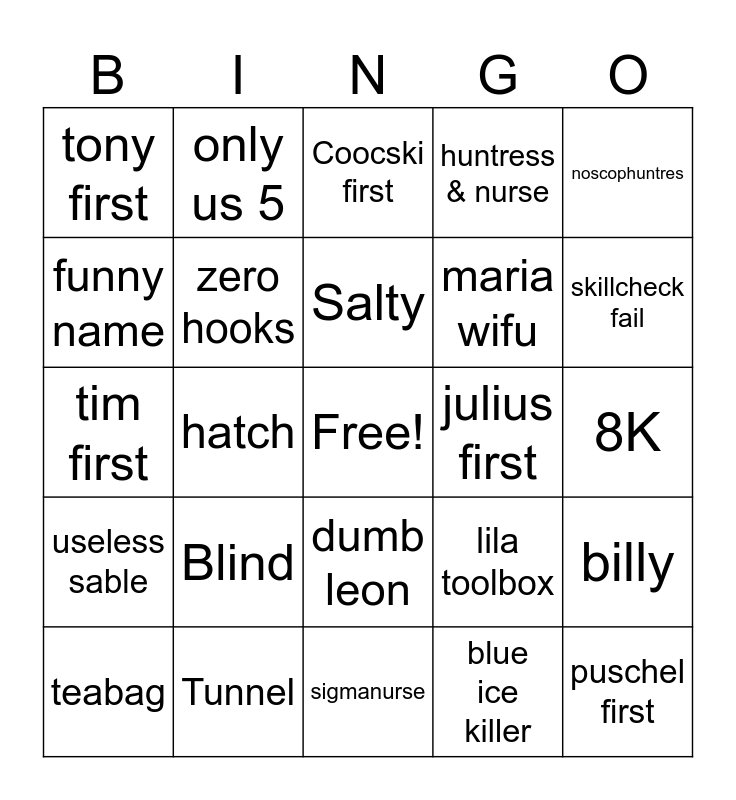 This bingo card has a free space and 24 words: Blind, Tunnel, Salty, teabag, noscophuntres, tony first, funny name, only us 5, julius first, dumb leon, maria wifu, tim first, lila toolbox, billy, zero hooks, blue ice killer, 8K, Coocski first, skillcheck fail, hatch, puschel first, useless sable, huntress & nurse and sigmanurse.