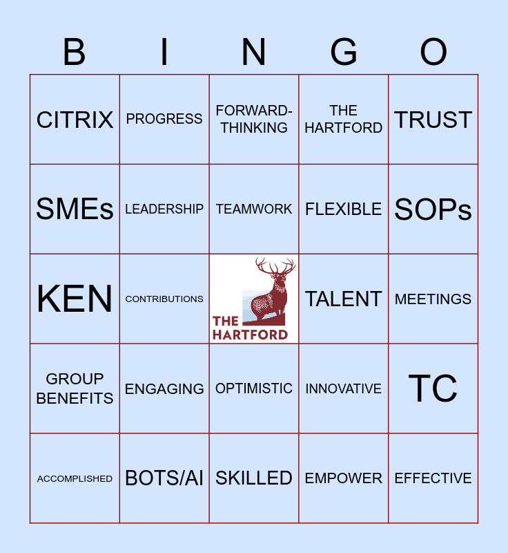 This bingo card has a free space and 73 words: ALTERYX, CFS, CITRIX, COLLABORATE, ETHICAL, FRIENDS, GROUP BENEFITS, INCLUSIVE, INNOVATIVE, INSPIRE, INSURANCE, LARRY THE STAG, LEADERSHIP, MEETINGS, PEAK SEASON, PROGRESS, SKILLED, SMEs, STRATEGIC, TALENT, TEAMWORK, THE HARTFORD, TRUST, VISION, ACCOMPLISHED, AIP, BEHAVIORS, BLUE, BOB, BOOM SHAKA LAKA, BOTS/AI, CHALLENGE, COMMITMENT, COMMUNITY, CONTRIBUTIONS, DEVELOPMENT, DISCOVER, DPP, EFFECTIVE, EFFICIENT, EMPOWER, ENGAGING, ERGs, EXCEL, FINANCE, FLEXIBLE, FORWARD-THINKING, FUN, GOALS, KEN, LAURIE, MADDY, MISSION, MOTIVATE, MS TEAMS, MUSIC, NANCY, OPTIMISTIC, PASSION, PAYMENTS, PAYROLL, PURPOSE, SMILE, SOPs, STEADY, SUPPORT, TAXABILITY, TAXES, TC, TENURE, TOGETHER, UNITY and VALUED.