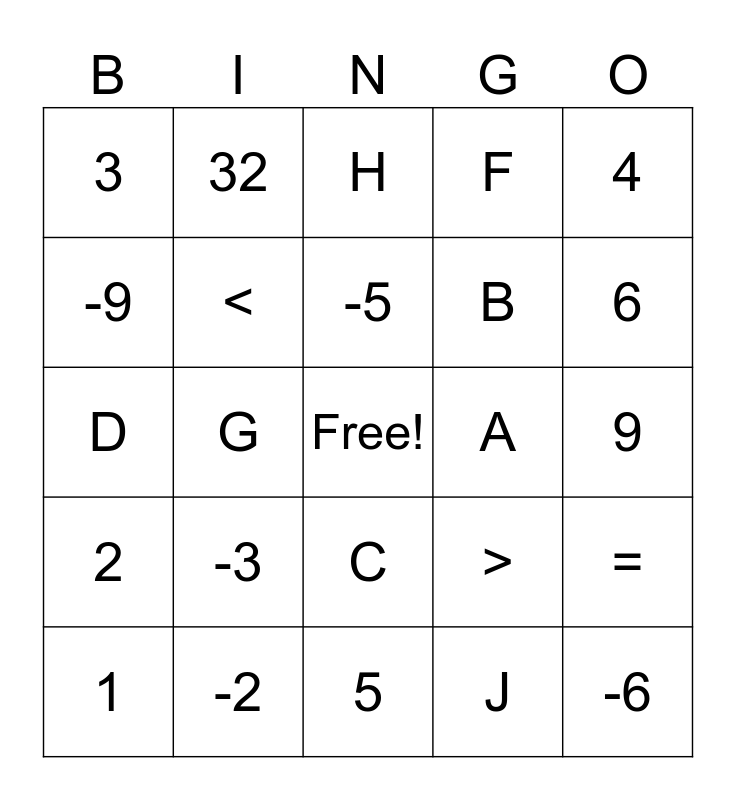 This bingo card has a free space and 24 words: -3, -2, -5, 1, 4, 3, -9, 32, A, C, B, D, >, =, <, J, 9, H, 6, G, -6, 2, F and 5.