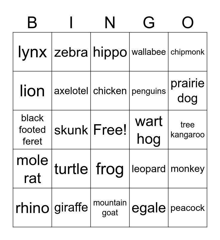 This bingo card has a free space and 62 words: elephant, giraffe, wolf, mole rat, ape, fish, axelotel, bee, penguins, vulture, wallabee, gofer, lion, tiger, bear, lynx, peacock, chipmonk, duck, chicken, wart hog, hippo, rhino, egale, okapee, moose, owl, porcupine, monkey, orangutang, gorilla, alligator, snake, lizard, tree kangaroo, zebra, lemur, guinee pig, skunk, armadillo, black footed feret, hedge hogs, turtle, beaver, prairie dog, leopard, snow leopard, mountain lion, crane, emu, frog, mountain goat, goat, hornbill, koi, opossum, otter, parrot, pelican, rabbit, sloth and tenrec.
