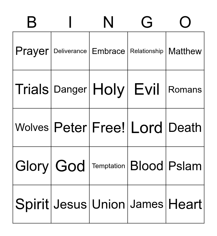This bingo card has a free space and 24 words: God, Jesus, Holy, Spirit, Matthew, Prayer, Trials, Deliverance, Lord, Temptation, Evil, Wolves, Blood, Pslam, Danger, James, Death, Embrace, Romans, Peter, Heart, Glory, Relationship and Union.