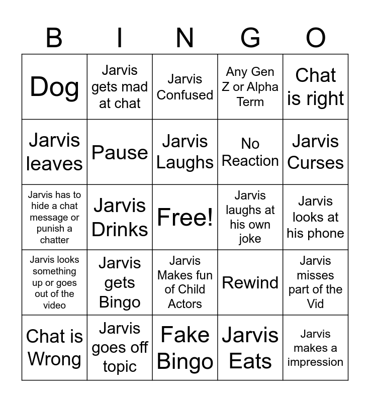 This bingo card has a free space and 25 words: Jarvis gets Bingo, Fake Bingo, Jarvis Laughs, Chat is Wrong, Chat is right, Dog, Jarvis leaves, Jarvis gets mad at chat, Jarvis laughs at his own joke, Jarvis Makes fun of Child Actors, No Reaction, Jarvis has to hide a chat message or punish a chatter, Rewind, Jarvis misses part of the Vid, Pause, Jarvis Makes fun of Pronunciation, Jarvis looks at his phone, Jarvis Confused, Jarvis Curses, Jarvis Drinks, Jarvis makes a impression, Jarvis goes off topic, Jarvis looks something up or goes out of the video, Any Gen Z or Alpha Term and Jarvis Eats.