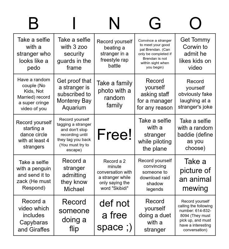 This bingo card has a free space and 25 words: Record a stranger admitting they know Michael, def not a free space ;), Take a family photo with a random family, Record a video which includes Capybaras and Giraffes, Get Tommy Corwin to admit he likes kids on video, Take a selfie with a stranger who looks like a pedo, Have a random couple (No Kids, Not Married) record a super cringe video of you, Take a selfie with 3 zoo security guards in the frame, Take a selfie with a stranger while piloting the plane, Record a 2 minute conversation with a stranger while only saying the word "Skibidi", Record yourself asking staff for a manager for any reason, Record yourself starting a dance circle with at least 4 strangers, Record yourself convincing someone to download raid shadow legends, Take a picture of an animal mewing, Get proof that a stranger is subscribed to Monterey Bay Aquarium, Record yourself saying "Rev up those fryers because i sure am hungry" to an employee, Take a selfie with a random baddie (define as you choose), Record yourself beating a stranger in a freestyle rap battle, Record yourself obviously fake laughing at a stranger's joke, Record yourself tagging a stranger and don't stop recording until they tag you back (You must try to escape), Record yourself calling the following number: 614-832-8094 (They must pick up, and must have a interesting conversation), Record someone doing a flip, Take a selfie with a penguin and send it to zack (He must Respond), Convince a stranger to meet your good pal Brendan. (Can only be completed if Brendan is not within sight when you begin) and Record yourself doing a duet with a stranger.