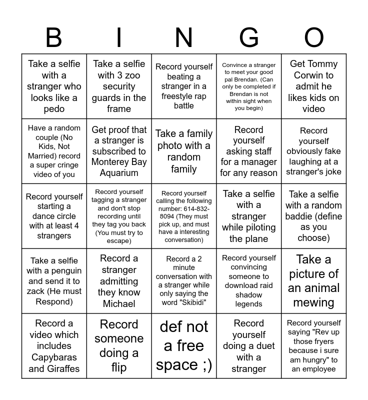 This bingo card has 25 words: Record a stranger admitting they know Michael, def not a free space ;), Take a family photo with a random family, Record a video which includes Capybaras and Giraffes, Get Tommy Corwin to admit he likes kids on video, Take a selfie with a stranger who looks like a pedo, Have a random couple (No Kids, Not Married) record a super cringe video of you, Take a selfie with 3 zoo security guards in the frame, Take a selfie with a stranger while piloting the plane, Record a 2 minute conversation with a stranger while only saying the word "Skibidi", Record yourself asking staff for a manager for any reason, Record yourself starting a dance circle with at least 4 strangers, Record yourself convincing someone to download raid shadow legends, Take a picture of an animal mewing, Get proof that a stranger is subscribed to Monterey Bay Aquarium, Record yourself saying "Rev up those fryers because i sure am hungry" to an employee, Take a selfie with a random baddie (define as you choose), Record yourself beating a stranger in a freestyle rap battle, Record yourself obviously fake laughing at a stranger's joke, Record yourself tagging a stranger and don't stop recording until they tag you back (You must try to escape), Record yourself calling the following number: 614-832-8094 (They must pick up, and must have a interesting conversation), Record someone doing a flip, Take a selfie with a penguin and send it to zack (He must Respond), Convince a stranger to meet your good pal Brendan. (Can only be completed if Brendan is not within sight when you begin) and Record yourself doing a duet with a stranger.