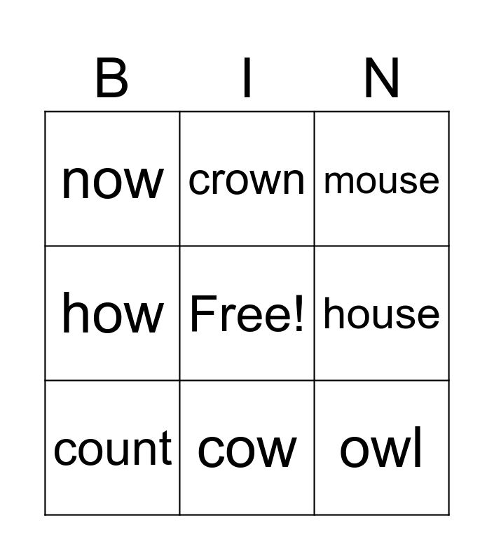 This bingo card has a free space and 11 words: brown, cow, owl, count, crown, mouse, house, mouth, how, now and cloud.