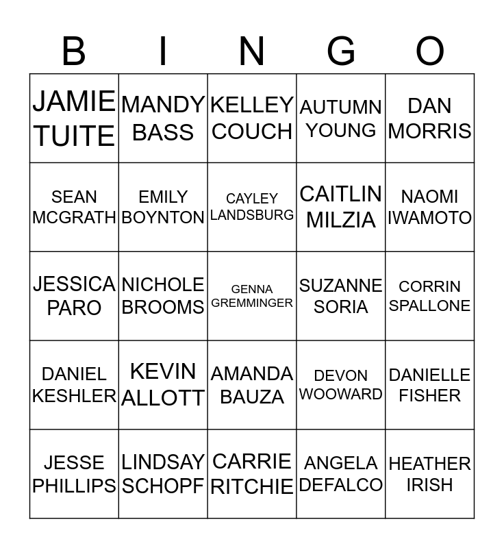This bingo card has 42 words: Free!, CAYLEY LANDSBURG, ERIKA GILEVSKI, KEVIN ALLOTT, ANGELA DEFALCO, DANIELLE FISHER, GENNA GREMMINGER, MARCEA DIGABRIELE, KELLEY COUCH, AMANDA BAUZA, CORRIN SPALLONE, NAOMI IWAMOTO, NICHOLE BROOMS, DAN MORRIS, ASHLEY NOVAK, DEVON WOOWARD, ERIN SCHAAF, JESSICA PARO, KYLE BROSSEAU, MANDY BASS, SEAN MCGRATH, TIM GUILLEMETTE, HEATHER IRISH, JAMIE TUITE, JULIEANN VANAALST, THERESA DAHL, CAITLIN MILZIA, MATT KNAPP, RYAN BELANGER, ERIN CONNOLLY, NICHOLE SMITH, DANIEL KESHLER, EMILY BOYNTON, CARRIE RITCHIE, JANELLE THOMAS, JESSE PHILLIPS, LINDSAY SCHOPF, SUZANNE SORIA, TAYLOR BECKER, LAURA KIELISZAK, AUTUMN YOUNG and KEITH ZIEGLER.