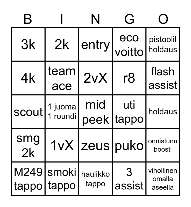 This bingo card has 25 words: 1vX, haulikko tappo, 2vX, M249 tappo, pistoolil holdaus, 3k, 4k, 2k, uti tappo, zeus, r8, scout, puko, onnistunu boosti, team ace, vihollinen omalla aseella, holdaus, entry, flash assist, 1 juoma 1 roundi, mid peek, smoki tappo, smg 2k, eco voitto and 3 assist.