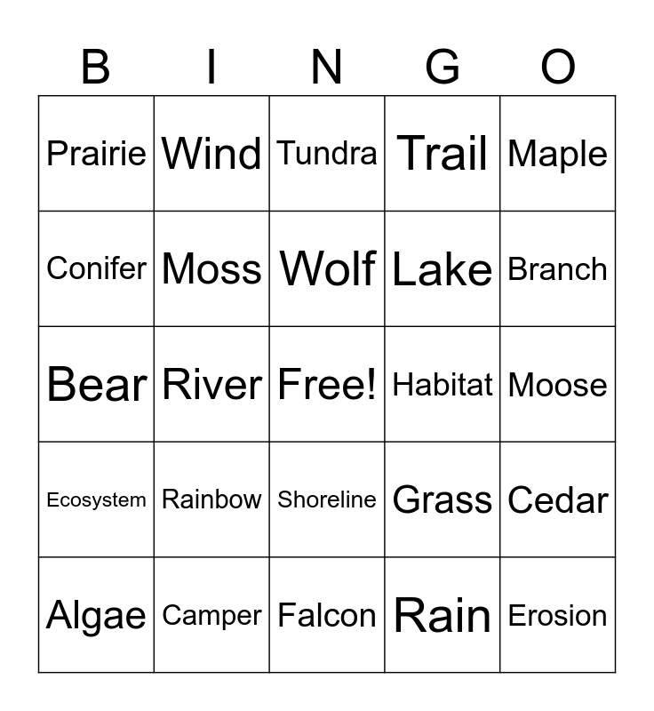 This bingo card has a free space and 70 words: Tree, Moose, Boat, Swimming, Camper, Tent, Trail, Leaf, Maple, Oak, Cedar, Cottonwood, Prairie, Tundra, Mountains, River, Shoreline, Lake, Ranger, Ecosystem, Habitat, Grass, Branch, Bark, Insect, Horizon, Sun, Cloud, Rain, Soil, Wind, Steam, Pond, Swamp, Frog, Snake, Moon, Pine Cone, Delta, Conifer, Pine, Rainbow, Erosion, Rapids, Wave, Moss, Algae, Carp, Walleye, Sunfish, Northern Pike, Meadowlark, Cardinal, Eagle, Falcon, Goose, Wolf, Coyote, Pronghorn, Elk, Bear, Porcupine, Photosynthesis, Evaporation, Condensation, Precipitation, Canopy, Roots, Plants and Wildfire.