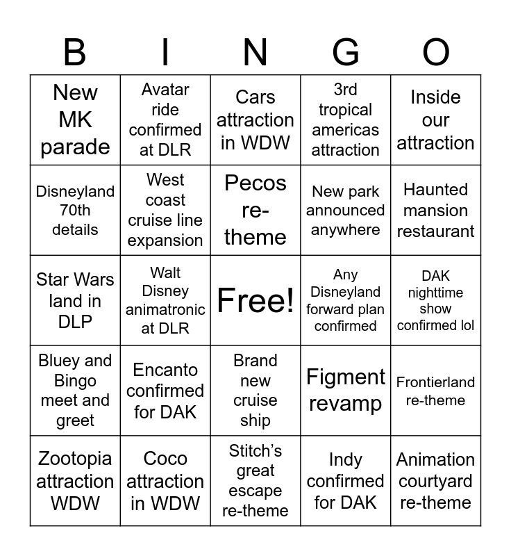 This bingo card has a free space and 24 words: Encanto confirmed for DAK, Coco attraction in WDW, Pecos re-theme, Zootopia attraction WDW, Inside our attraction, New MK parade, Disneyland 70th details, Avatar ride confirmed at DLR, Any Disneyland forward plan confirmed, Brand new cruise ship, New park announced anywhere, Star Wars land in DLP, Figment revamp, Frontierland re-theme, West coast cruise line expansion, Indy confirmed for DAK, DAK nighttime show confirmed lol, Cars attraction in WDW, Haunted mansion restaurant, Walt Disney animatronic at DLR, Animation courtyard re-theme, Bluey and Bingo meet and greet, 3rd tropical americas attraction and Stitch’s great escape re-theme.