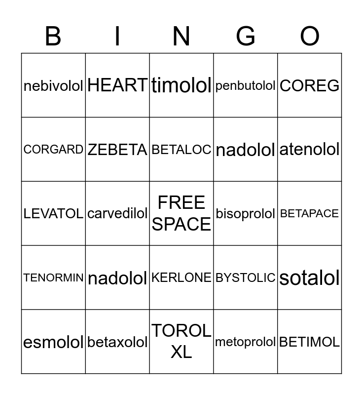 This bingo card has a free space and 24 words: nadolol, betaxolol, BETALOC, esmolol, COREG, nebivolol, CORGARD, HEART, bisoprolol, KERLONE, nadolol, LEVATOL, BYSTOLIC, sotalol, ZEBETA, metoprolol, BETAPACE, timolol, atenolol, carvedilol, BETIMOL, TENORMIN, penbutolol and TOROL XL.