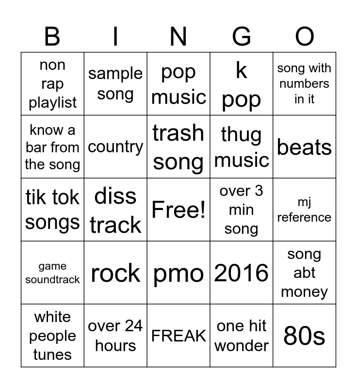 This bingo card has a free space and 24 words: rock, over 24 hours, trash song, white people tunes, song with numbers in it, non rap playlist, know a bar from the song, sample song, over 3 min song, pmo, thug music, tik tok songs, 2016, song abt money, country, one hit wonder, mj reference, pop music, beats, diss track, 80s, game soundtrack, k pop and FREAK.