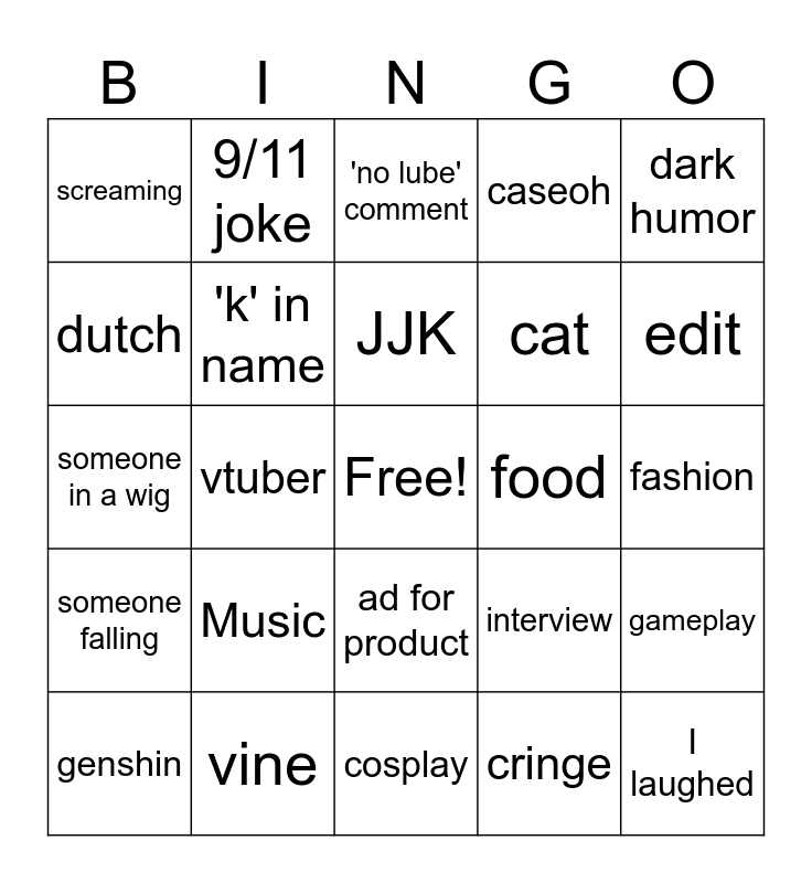 This bingo card has a free space and 24 words: Music, vine, JJK, genshin, dark humor, screaming, dutch, 9/11 joke, food, ad for product, cat, someone in a wig, interview, gameplay, 'k' in name, cringe, fashion, 'no lube' comment, edit, vtuber, I laughed, someone falling, caseoh and cosplay.