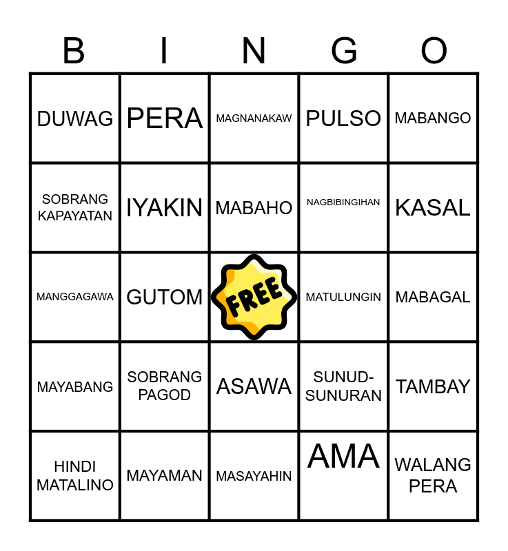 This bingo card has a free space and 29 words: HINDI MATALINO, MAHINHIN, GUTOM, PALAAWAY, DUWAG, MAGNANAKAW, IYAKIN, SOBRANG PAGOD, MATULUNGIN, MAYAMAN, MABAGAL, WALANG PERA, MASAYAHIN, AMA, KASAL, MASIPAG, ASAWA, MAYABANG, MABANGO, MANGGAGAWA, SUNUD-SUNURAN, BISTADO, NAGBIBINGIHAN, SOBRANG KAPAYATAN, PULSO, PERA, TAMBAY, MABAHO and MATABA.