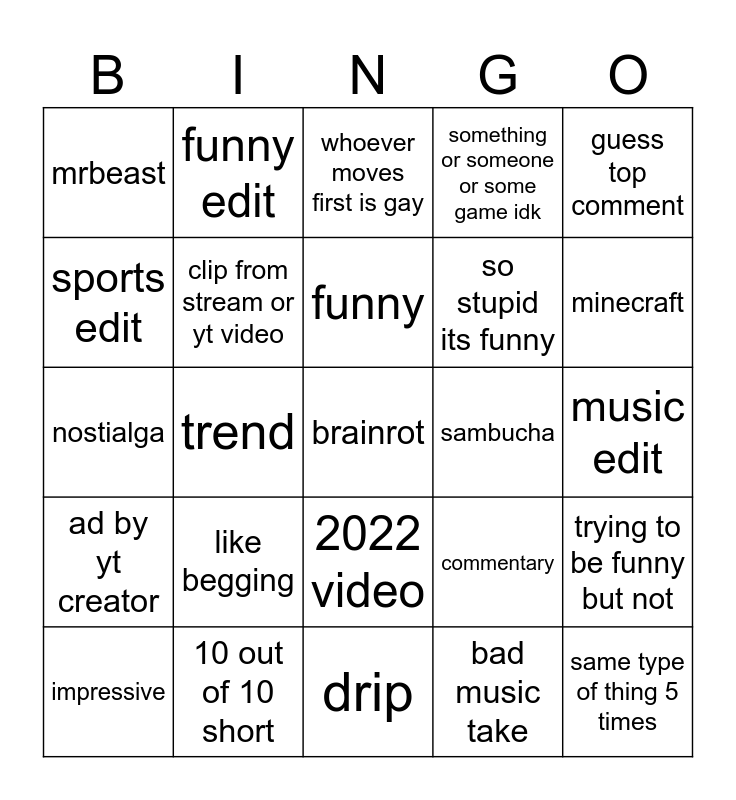 This bingo card has a free space and 24 words: like begging, 10 out of 10 short, funny, impressive, guess top comment, mrbeast, sports edit, funny edit, sambucha, 2022 video, so stupid its funny, nostialga, commentary, trying to be funny but not, clip from stream or yt video, bad music take, music edit, whoever moves first is gay, minecraft, trend, same type of thing 5 times, ad by yt creator, something or someone or some game idk and drip.