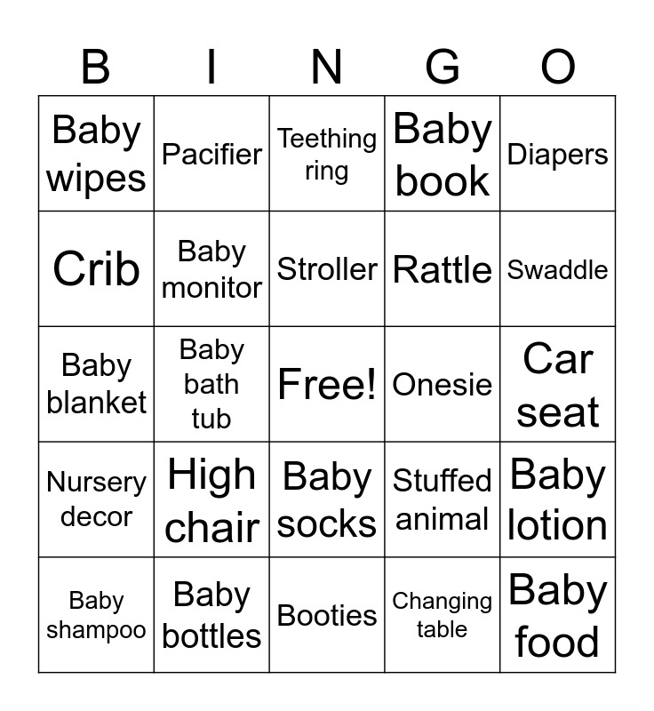 This bingo card has a free space and 24 words: High chair, Baby bottles, Stroller, Baby shampoo, Diapers, Baby wipes, Crib, Pacifier, Onesie, Baby socks, Rattle, Baby blanket, Stuffed animal, Baby lotion, Baby monitor, Changing table, Car seat, Teething ring, Swaddle, Baby bath tub, Baby food, Nursery decor, Baby book and Booties.