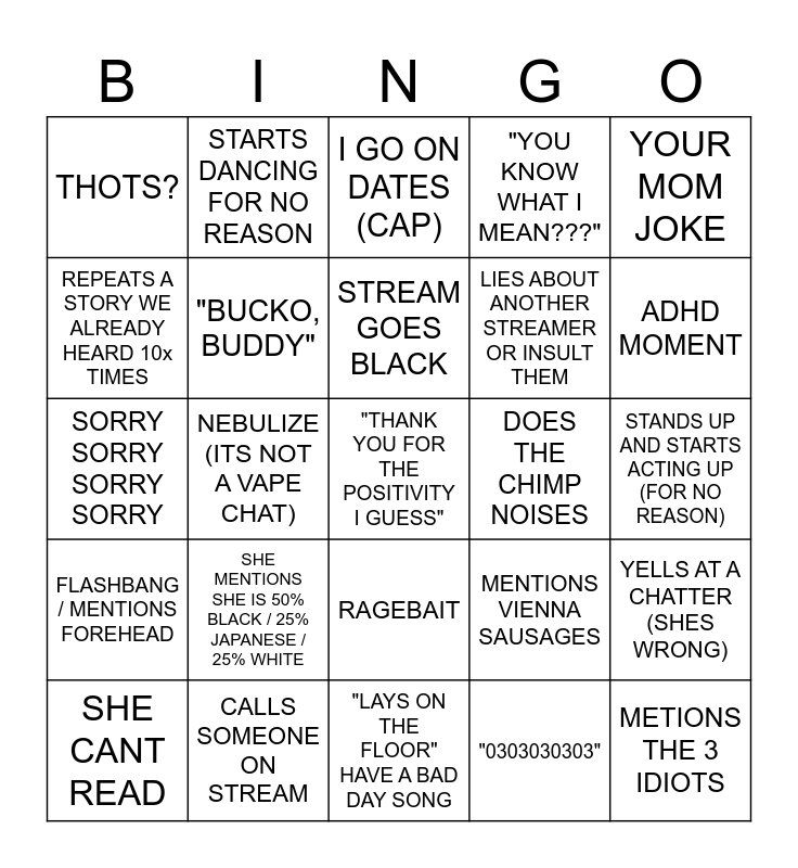 This bingo card has a free space and 24 words: SHE MENTIONS SHE IS 50% BLACK / 25% JAPANESE / 25% WHITE, CALLS SOMEONE ON STREAM, STREAM GOES BLACK, SHE CANT READ, YOUR MOM JOKE, THOTS?, REPEATS A STORY WE ALREADY HEARD 10x TIMES, STARTS DANCING FOR NO REASON, DOES THE CHIMP NOISES, RAGEBAIT, LIES ABOUT ANOTHER STREAMER OR INSULT THEM, SORRY SORRY SORRY SORRY, MENTIONS VIENNA SAUSAGES, YELLS AT A CHATTER (SHES WRONG), "BUCKO, BUDDY", "0303030303", STANDS UP AND STARTS ACTING UP (FOR NO REASON), I GO ON DATES (CAP), ADHD MOMENT, NEBULIZE (ITS NOT A VAPE CHAT), METIONS THE 3 IDIOTS, FLASHBANG / MENTIONS FOREHEAD, "YOU KNOW WHAT I MEAN???" and "LAYS ON THE FLOOR" HAVE A BAD DAY SONG.