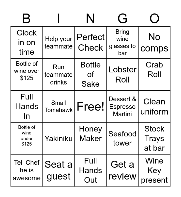 This bingo card has a free space and 24 words: Yakiniku, Seat a guest, Bottle of Sake, Tell Chef he is awesome, No comps, Clock in on time, Bottle of wine over $125, Help your teammate, Dessert & Espresso Martini, Honey Maker, Lobster Roll, Full Hands In, Seafood tower, Stock Trays at bar, Run teammate drinks, Get a review, Clean uniform, Perfect Check, Crab Roll, Small Tomahawk, Wine Key present, Bottle of wine under $125, Bring wine glasses to bar and Full Hands Out.