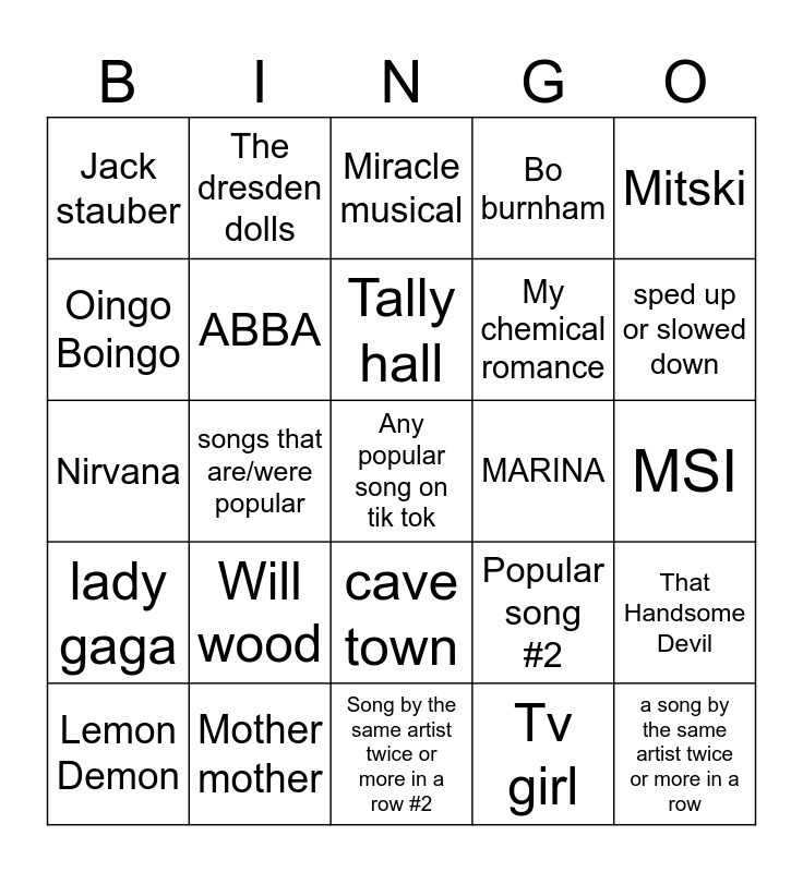 This bingo card has a free space and 24 words: Will wood, Mother mother, Tally hall, Lemon Demon, Mitski, Jack stauber, Oingo Boingo, The dresden dolls, MARINA, cave town, My chemical romance, Nirvana, Popular song #2, That Handsome Devil, ABBA, Tv girl, MSI, Miracle musical, sped up or slowed down, songs that are/were popular, a song by the same artist twice or more in a row, lady gaga, Bo burnham and Song by the same artist twice or more in a row #2.