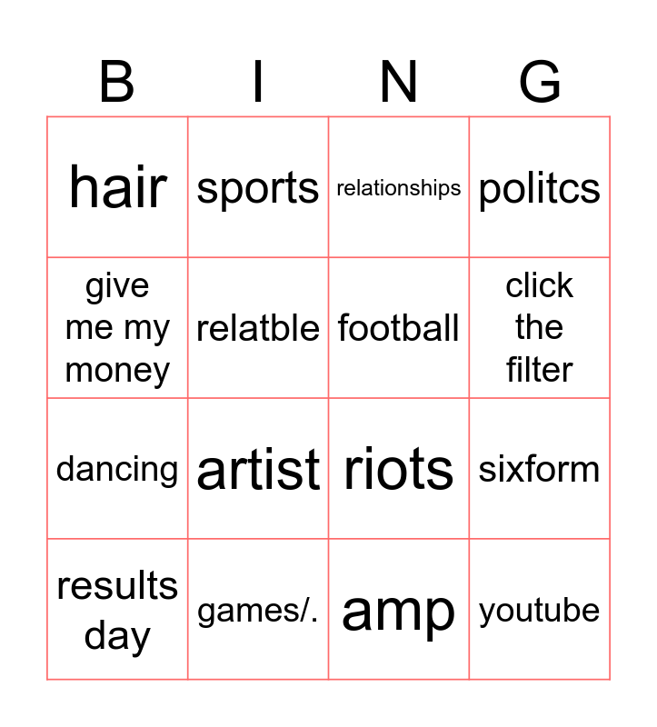 This bingo card has 16 words: games/., sixform, relationships, hair, dancing, sports, riots, amp, give me my money, relatble, results day, politcs, artist, click the filter, football and youtube.