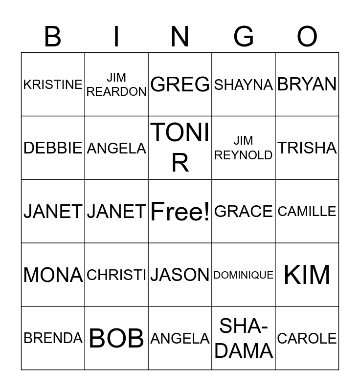 This bingo card has a free space and 24 words: CHRISTI, BOB, TONI R, BRENDA, BRYAN, KRISTINE, DEBBIE, JIM REARDON, GRACE, JASON, JIM REYNOLD, JANET, DOMINIQUE, KIM, ANGELA, SHA-DAMA, CAMILLE, GREG, TRISHA, JANET, CAROLE, MONA, SHAYNA and ANGELA.