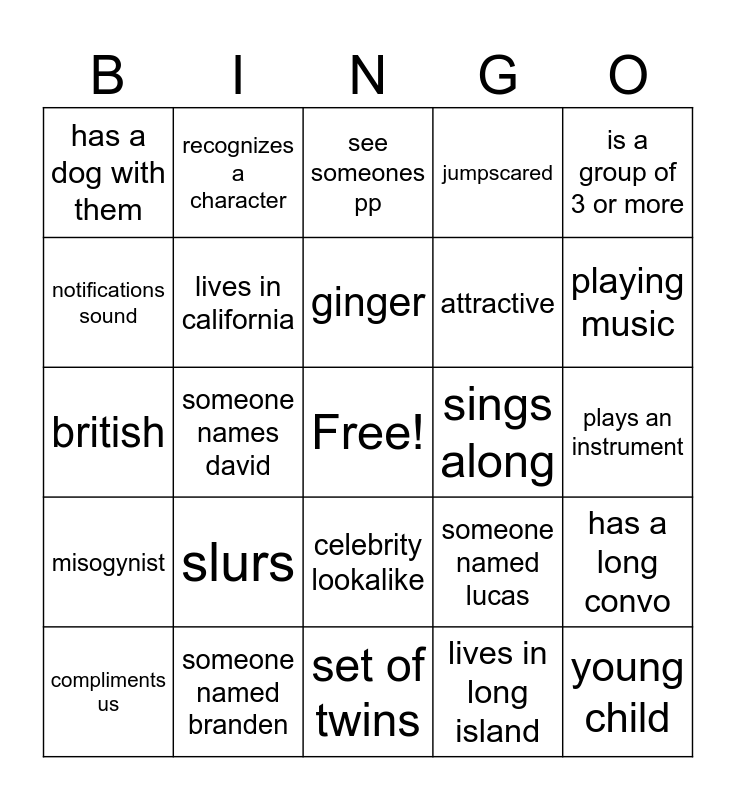 This bingo card has a free space and 24 words: slurs, someone named branden, ginger, compliments us, is a group of 3 or more, has a dog with them, notifications sound, recognizes a character, sings along, celebrity lookalike, attractive, british, someone named lucas, has a long convo, lives in california, lives in long island, plays an instrument, see someones pp, playing music, someone names david, young child, misogynist, jumpscared and set of twins.