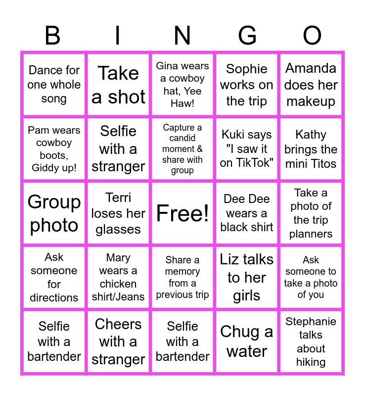This bingo card has a free space and 24 words: Mary wears a chicken shirt/Jeans, Cheers with a stranger, Capture a candid moment & share with group, Selfie with a bartender, Amanda does her makeup, Dance for one whole song, Pam wears cowboy boots, Giddy up!, Take a shot, Dee Dee wears a black shirt, Share a memory from a previous trip, Kuki says "I saw it on TikTok", Group photo, Liz talks to her girls, Ask someone to take a photo of you, Selfie with a stranger, Chug a water, Take a photo of the trip planners, Gina wears a cowboy hat, Yee Haw!, Kathy brings the mini Titos, Terri loses her glasses, Stephanie talks about hiking, Ask someone for directions, Sophie works on the trip and Selfie with a bartender.