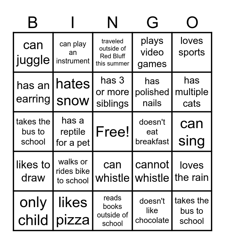This bingo card has a free space and 24 words: walks or rides bike to school, likes pizza, has 3 or more siblings, only child, loves sports, can juggle, has an earring, can play an instrument, doesn't eat breakfast, can whistle, has polished nails, takes the bus to school, cannot whistle, loves the rain, hates snow, doesn't like chocolate, can sing, traveled outside of Red Bluff this summer, has multiple cats, has a reptile for a pet, takes the bus to school, likes to draw, plays video games and reads books outside of school.