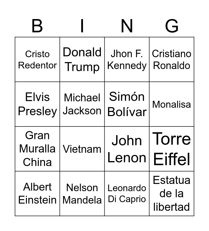This bingo card has 46 words: Free!, Albert Einstein, Princesa Diana, Reina Isabel, Marylin Monroe, Taylor Swift, Donald Trump, Frida Kahlo, Michael Jackson, Turquía, Simón Bolívar, Cristiano Ronaldo, Messi, Pablo Escobar, Alfonso Espinoza, Freddy Mercury, Monalisa, Nelson Mandela, Guatemala, Elvis Presley, Torre Eiffel, Machu Picchu, Cristo Redentor, Gran Muralla China, Portugal, Vietnam, Marruecos, Taj Mahal, Islas Galápagos, Estatua de la libertad, Francia, cleopatra, Coliseo romano, Barack Obama, Beyonce, Shakira, Leonardo Di Caprio, William Shakespeare, Walt Disney, Hollywood, Big Ben, Jhon F. Kennedy, John Lenon, Rascacielos Burj Khalifa, Harry Potter and George Washington.