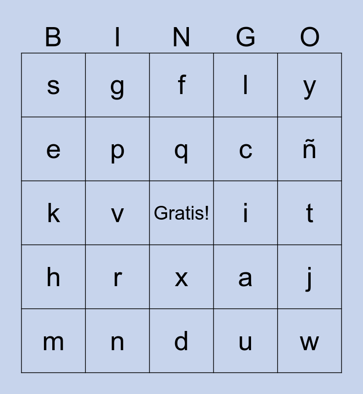 This bingo card has a free space and 27 words: a, b, c, d, e, f, g, h, i, j, k, l, m, n, ñ, o, p, q, r, s, t, u, v, w, x, y and z.