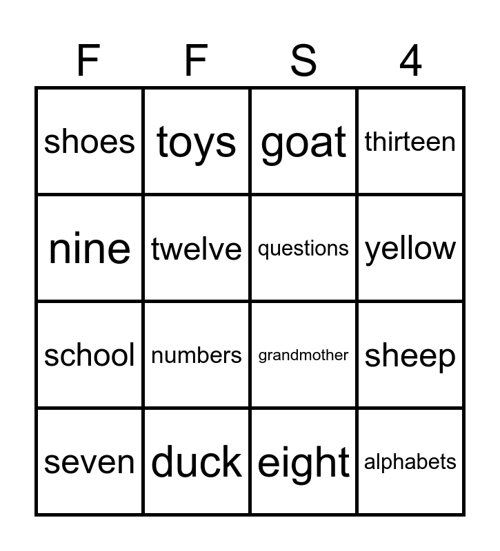 This bingo card has 16 words: duck, sheep, goat, shoes, school, toys, grandmother, eight, nine, twelve, seven, thirteen, numbers, yellow, questions and alphabets.