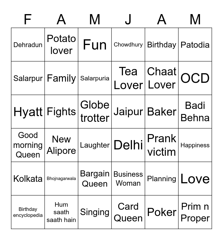This bingo card has 62 words: Free!, Delhi, Bombay, Jaipur, Kolkata, Jaisidih, Salarpur, Bhagalpur, Salarpuria, Loyalka, Chowdhury, Jhunjhunwala, Patodia, Bhojnagarwala, Holiday, Dehradun, Hyatt, Birthday, Celebration, Family, Fights, Fun, Laughter, Happiness, Dancing Queen, Singing, Love, Home, New Alipore, Poker, Challenge, Lady Boss, Grandma's Favourite, Pujarin, Globe trotter, Potato lover, Mishti Doi, Card Queen, OCD, Bargain Queen, Chaat Lover, Treasurer, Baker, Sweet Tooth, Tea Lover, Good morning Queen, Birthday encyclopedia, Panki, Jagriti, Shopaholic, Badi Behna, Prank victim, Oppressor, Darr ke aage jeet hain, Walking and talking, Business Woman, Hum saath saath hain, Prim n Proper, Matchmaker, Thai - ger, Planning and Cousins.