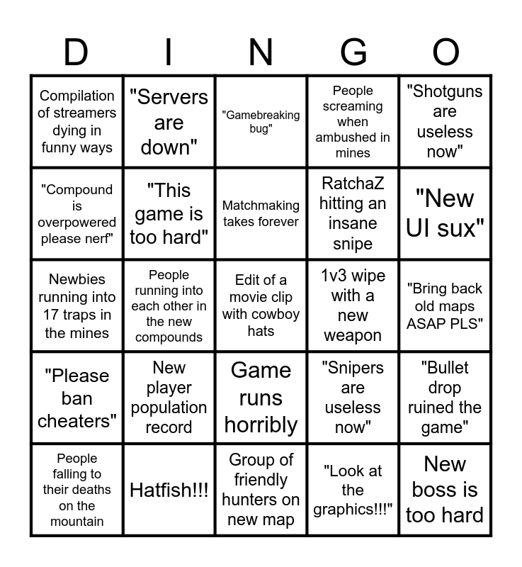 This bingo card has 28 words: "Bullet drop ruined the game", General Sam makes a video, RatchaZ hitting an insane snipe, "Look at the graphics!!!", "Compound is overpowered please nerf", "Gamebreaking bug", "Servers are down", "Please ban cheaters", 1v3 wipe with a new weapon, People falling to their deaths on the mountain, Newbies running into 17 traps in the mines, People screaming when ambushed in mines, Hatfish!!!, Group of friendly hunters on new map, "New UI sux", Twitch drops are broken again, New player population record, "This game is too hard", Matchmaking takes forever, Game runs horribly, Compilation of streamers dying in funny ways, New boss is too hard, Edit of a movie clip with cowboy hats, People running into each other in the new compounds, "Bring back old maps ASAP PLS", "Snipers are useless now", "Shotguns are useless now" and "Stop complaining about stuff and let devs fix it".