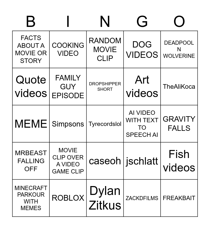 This bingo card has a free space and 34 words: JJK EDIT, ZACKDFILMS, MINECRAFT, GREENSCREEN KID, MRBEAST FALLING OFF, FAMILY GUY EPISODE, DEADPOOL N WOLVERINE, MINECRAFT PARKOUR WITH MEMES, COOKING VIDEO, A RANDOM COMMERCIAL, DROPSHIPPER SHORT, RANDOM MOVIE CLIP, DESPICABLE ME EDIT, h1t1, AI VIDEO WITH TEXT TO SPEECH AI, TheAliKoca, ROBLOX, MEME, MOVIE CLIP OVER A VIDEO GAME CLIP, jschlatt, caseoh, Olympics videos, FACTS ABOUT A MOVIE OR STORY, GRAVITY FALLS, Dylan Zitkus, FREAKBAIT, DOG VIDEOS, Okcron, Art videos, Quote videos, Rapper video, Simpsons, Fish videos and exposing videos.