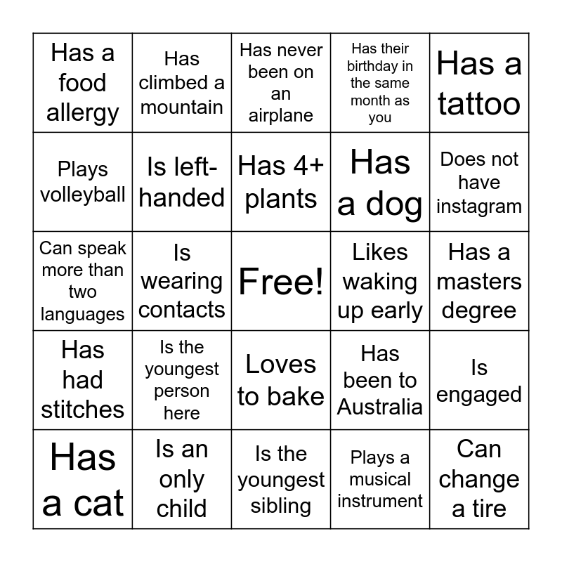 This bingo card has a free space and 29 words: Has a cat, Has worked in a cafe, Is wearing contacts, Is a vegetarian or vegan, Has a food allergy, Has never been on an airplane, Is left-handed, Is the youngest person here, Likes waking up early, Is an only child, Has a masters degree, Can change a tire, Is the youngest sibling, Plays a musical instrument, Does not have instagram, Has coloured hair, Loves to bake, Has had stitches, Has a tattoo, Can speak more than two languages, Has been to Australia, Doesn't drink coffee, Has a dog, Plays volleyball, Has their birthday in the same month as you, Has climbed a mountain, Is engaged, Has 4+ plants and Has a periodic table poster.