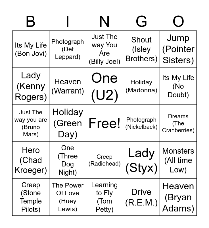 This bingo card has a free space and 47 words: Dreams (Fleetwood Mack), Heaven (Bryan Adams), Monsters (Shinedown), Learning to Fly (Tom Petty), One (Three Dog Night), Dreams (Van Halen), Photograph (Def Leppard), Jump (Van Halen), Lady (Kenny Rogers), Animals (Nickleback), Heaven (Warrant), Shout (Isley Brothers), Monsters (All time Low), Lady (Styx), Animals (Maroon 5), Learning To Fly (Pink Floyd), One (U2), Photograph (Nickelback), Shout (Tears for Fears), Jump (Pointer Sisters), Holiday (Green Day), Drive (R.E.M.), Its My Life (Bon Jovi), Holiday (Madonna), Drive (Cars), Its My Life (No Doubt), Creep (Stone Temple Pilots), Hero (Mariah Carey), Creep (Radiohead), Hero (Chad Kroeger), Poison (Bell Biv Devoe), The Power of Love (Celine Dion), Good Vibrations (Beach Boys), Crazy (Brittany Spears), Good Vibrations (Marky Mark), The Power Of Love (Huey Lewis), Dreams (The Cranberries), Jump (Kriss Kross), Poison (Alice Cooper), Hello (Adele), Hello (Lionel Ritchie), Just The way You Are (Billy Joel), Just The way you are (Bruno Mars), Our House (Crosby Stills Nash), Our House (Madness), Heartbreaker (Roling Stones) and Heartbreaker (Pat Benatar).