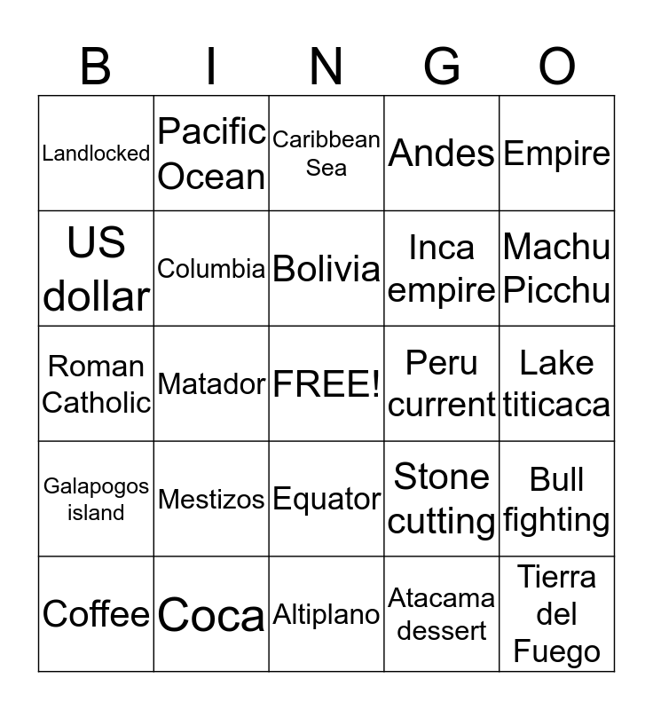 This bingo card has a free space and 24 words: Mestizos, Coca, Bolivia, Coffee, Empire, Landlocked, US dollar, Pacific Ocean, Peru current, Equator, Inca empire, Roman Catholic, Stone cutting, Bull fighting, Columbia, Atacama dessert, Lake titicaca, Caribbean Sea, Machu Picchu, Matador, Tierra del Fuego, Galapogos island, Andes and Altiplano.