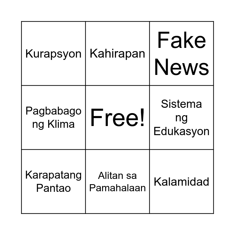 This bingo card has a free space and 8 words: Pagbabago ng Klima, Kahirapan, Sistema ng Edukasyon, Karapatang Pantao, Fake News, Kurapsyon, Alitan sa Pamahalaan and Kalamidad.