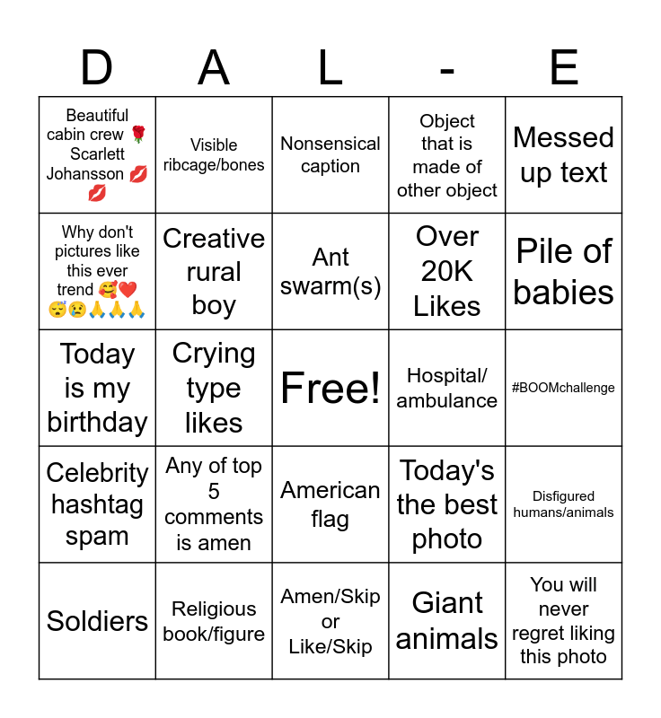 This bingo card has a free space and 24 words: Any of top 5 comments is amen, Religious book/figure, Ant swarm(s), Soldiers, Messed up text, Beautiful cabin crew 🌹 Scarlett Johansson 💋💋, Why don't pictures like this ever trend 🥰❤️😴😢🙏🙏🙏, Visible ribcage/bones, Hospital/ ambulance, American flag, Over 20K Likes, Today is my birthday, Today's the best photo, Disfigured humans/animals, Creative rural boy, Giant animals, #BOOMchallenge, Nonsensical caption, Pile of babies, Crying type likes, You will never regret liking this photo, Celebrity hashtag spam, Object that is made of other object and Amen/Skip or Like/Skip.