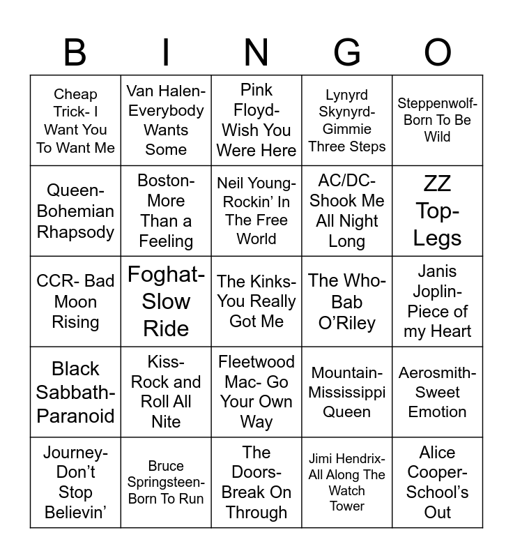 This bingo card has 28 words: Aerosmith- Sweet Emotion, Led Zeppelin-Kashmir, AC/DC- Shook Me All Night Long, Jimi Hendrix- All Along The Watch Tower, Queen- Bohemian Rhapsody, Pink Floyd- Wish You Were Here, Van Halen- Everybody Wants Some, Black Sabbath- Paranoid, The Who- Bab O’Riley, Journey- Don’t Stop Believin’, CCR- Bad Moon Rising, Lynyrd Skynyrd- Gimmie Three Steps, Bruce Springsteen- Born To Run, The Doors- Break On Through, ZZ Top- Legs, Bob Seger- Old Time Rock n Roll, Kiss- Rock and Roll All Nite, Boston- More Than a Feeling, Neil Young- Rockin’ In The Free World, Fleetwood Mac- Go Your Own Way, Cheap Trick- I Want You To Want Me, Alice Cooper- School’s Out, The Kinks- You Really Got Me, Foghat- Slow Ride, Janis Joplin- Piece of my Heart, Mountain- Mississippi Queen, Steppenwolf- Born To Be Wild and George Thorogood- Bad To The Bone.