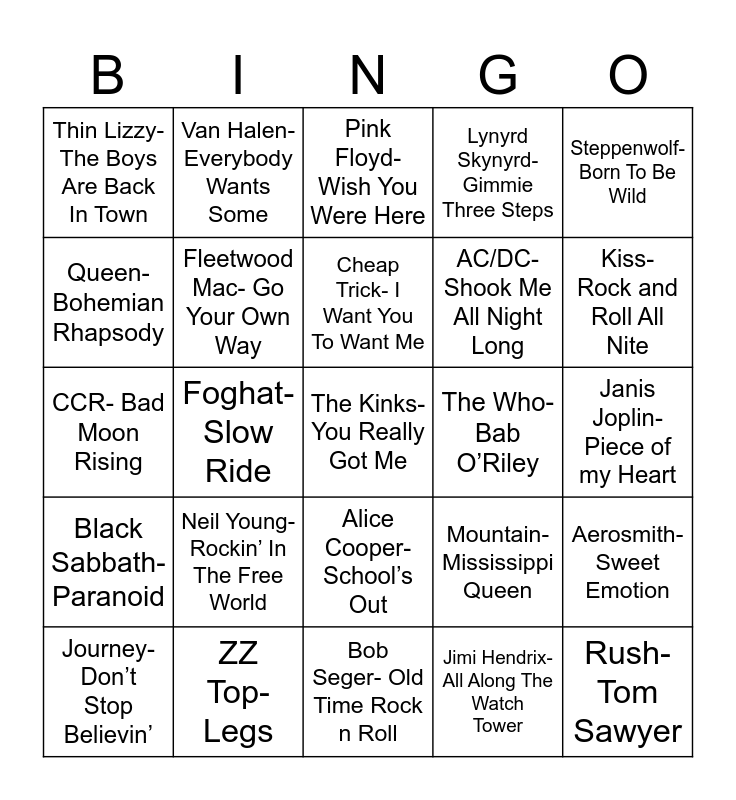 This bingo card has 28 words: Aerosmith- Sweet Emotion, Led Zeppelin-Kashmir, AC/DC- Shook Me All Night Long, Jimi Hendrix- All Along The Watch Tower, Queen- Bohemian Rhapsody, Pink Floyd- Wish You Were Here, Van Halen- Everybody Wants Some, Black Sabbath- Paranoid, The Who- Bab O’Riley, Journey- Don’t Stop Believin’, CCR- Bad Moon Rising, Lynyrd Skynyrd- Gimmie Three Steps, ZZ Top- Legs, Bob Seger- Old Time Rock n Roll, Kiss- Rock and Roll All Nite, Boston- More Than a Feeling, Neil Young- Rockin’ In The Free World, Fleetwood Mac- Go Your Own Way, Cheap Trick- I Want You To Want Me, Alice Cooper- School’s Out, Thin Lizzy- The Boys Are Back In Town, Rush- Tom Sawyer, The Kinks- You Really Got Me, Foghat- Slow Ride, Janis Joplin- Piece of my Heart, Mountain- Mississippi Queen, Steppenwolf- Born To Be Wild and George Thorogood- Bad To The Bone.
