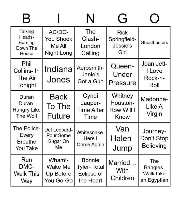 This bingo card has 32 words: Married…With Children, Cheers, Back To The Future, The Golden Girls, The Police- Every Breathe You Take, Indiana Jones, Ghostbusters, Journey-Don't Stop Believing, AC/DC-You Shook Me All Night Long, The Bangles- Walk Like an Egyptian, Aerosmith-Janie’s Got a Gun, The Clash- London Calling, Night Ranger-Sister Christian, Soft Cell- Tainted Love, Whitney Houston- How Will I Know, U2-With or Without You, Run DMC- Walk This Way, Duran Duran- Hungry Like The Wolf, Whitesnake-Here I Come Again, Def Leopard- Pour Some Sugar On Me, Van Halen-Jump, INXS-Need You Tonight, Madonna- Like A Virgin, Wham!-Wake Me Up Before You Go-Go, Cyndi Lauper- Time After Time, Rick Springfield-Jessie's Girl, Queen-Under Pressure, Phil Collins- In The Air Tonight, Talking Heads-Burning Down The House, Bonnie Tyler- Total Eclipse of the Heart, UB40- Red Red Wine and Joan Jett- I Love Rock-n-Roll.