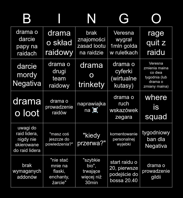 This bingo card has a free space and 24 words: "masz coś jeszcze do powiedzenia?", "nie stać mnie na flaski, enchanty, żarcie", drama o trinkety, brak wymaganych addonów, rage quit z raidu, drama o darcie papy na raidach, darcie mordy Negativa, drama o skład raidowy, drama o ruch wskazówek zegara, "kiedy przerwa?", drama o cyferki (wirtualne kutasy), drama o loot, komentowanie personalnej wyjebki, tygodniowy ban dla Negativa, drama o drugi team raidowy, start raidu o 20, pierwsze podejście do bossa 20.40, where is squad, brak znajomości zasad lootu na raidzie, Veresna zmienia maina co dwa tygodnia (lub drama o zmiany maina), drama o prowadzenie raidów, drama o prowadzenie gildii, uwagi do raid lidera, nigdy nie skierowane do raid lidera, Veresna wygrał 1mln golda w ruletkach and "szybkie bio", trwające więcej niż 30min.