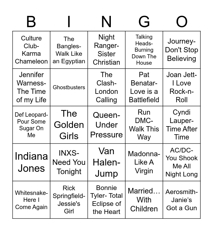 This bingo card has 32 words: Married…With Children, Back To The Future, The Golden Girls, The Police- Every Breathe You Take, Indiana Jones, Ghostbusters, Journey-Don't Stop Believing, AC/DC-You Shook Me All Night Long, The Bangles- Walk Like an Egyptian, Aerosmith-Janie’s Got a Gun, The Clash- London Calling, Night Ranger-Sister Christian, Whitney Houston- How Will I Know, U2-With or Without You, Run DMC- Walk This Way, Duran Duran- Hungry Like The Wolf, Whitesnake-Here I Come Again, Def Leopard- Pour Some Sugar On Me, Van Halen-Jump, INXS-Need You Tonight, Madonna- Like A Virgin, Wham!-Wake Me Up Before You Go-Go, Cyndi Lauper- Time After Time, Rick Springfield-Jessie's Girl, Queen-Under Pressure, Talking Heads-Burning Down The House, Pat Benatar-Love is a Battlefield, Jennifer Warness- The Time of my Life, Culture Club- Karma Chameleon, Bonnie Tyler- Total Eclipse of the Heart, UB40- Red Red Wine and Joan Jett- I Love Rock-n-Roll.