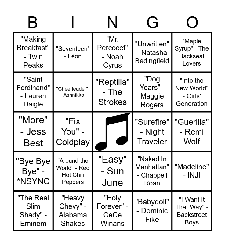 This bingo card has a free space and 24 words: "Around the World" - Red Hot Chili Peppers, "Heavy Chevy" - Alabama Shakes, "Reptilla" - The Strokes, "The Real Slim Shady" - Eminem, "Maple Syrup" - The Backseat Lovers, "Making Breakfast" - Twin Peaks, "Saint Ferdinand" - Lauren Daigle, "Seventeen" - Léon, "Surefire" - Night Traveler, "Easy" - Sun June, "Dog Years" - Maggie Rogers, "More" - Jess Best, "Naked In Manhattan" - Chappell Roan, "Madeline" - INJI, "Cheerleader". -Ashnikko, "Babydoll" - Dominic Fike, "Guerilla" - Remi Wolf, "Mr. Percocet" - Noah Cyrus, "Into the New World" - Girls' Generation, "Fix You" - Coldplay, "I Want It That Way" - Backstreet Boys, "Bye Bye Bye" - *NSYNC, "Unwritten" - Natasha Bedingfield and "Holy Forever" - CeCe Winans.